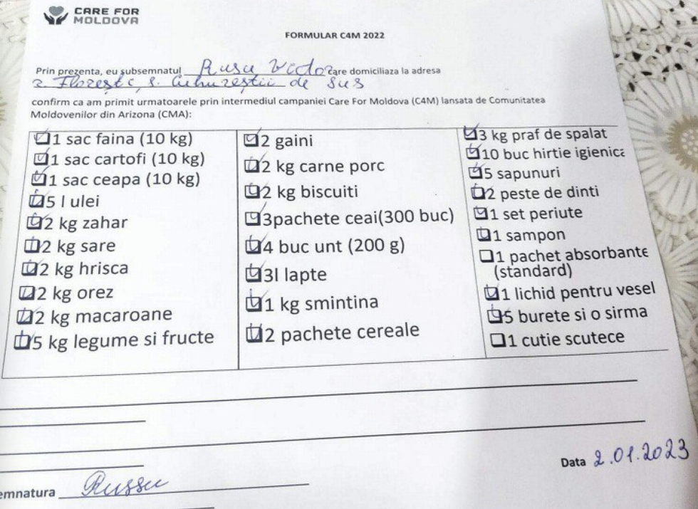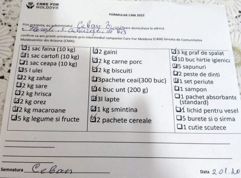 1530 lei = (794 lei + *736 lei) was leftover after Cuhurestii de Sus C4M Care Package Purchase. Another vulnerable family from Cuhurestii de Sus will be selected and helped with this money.