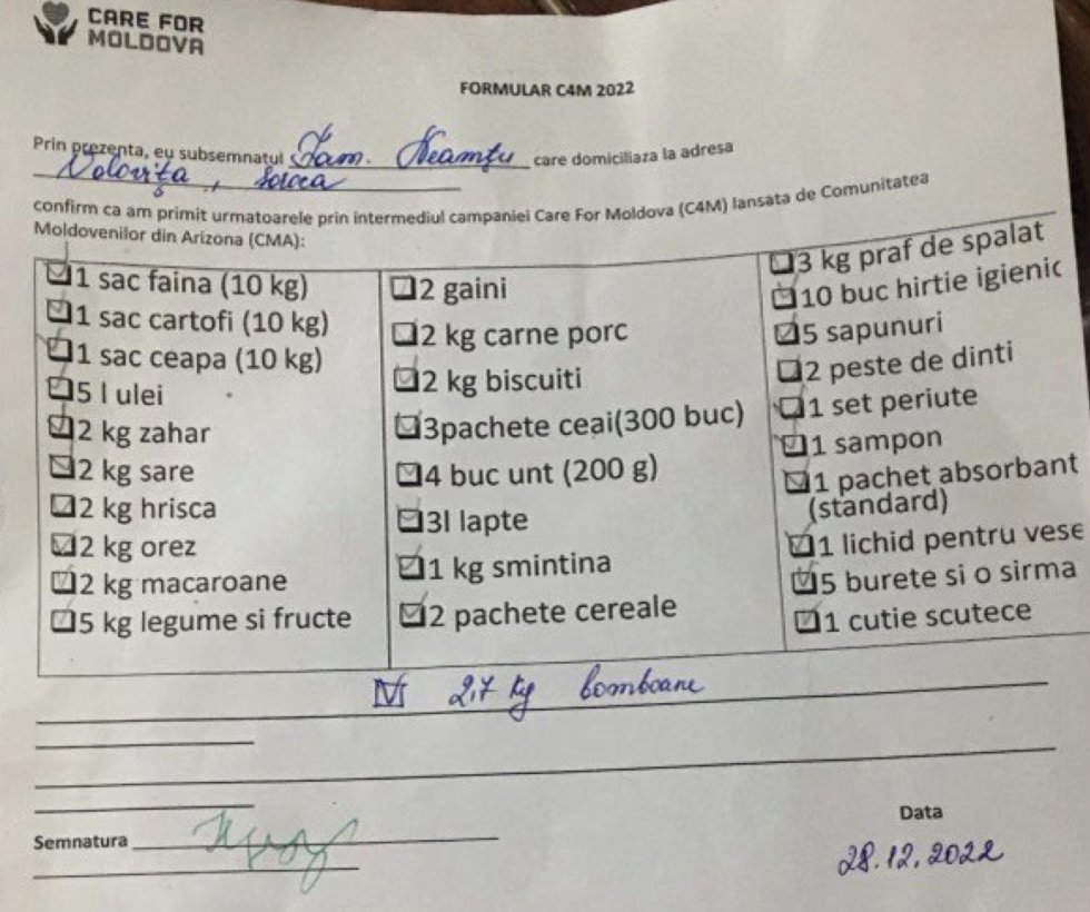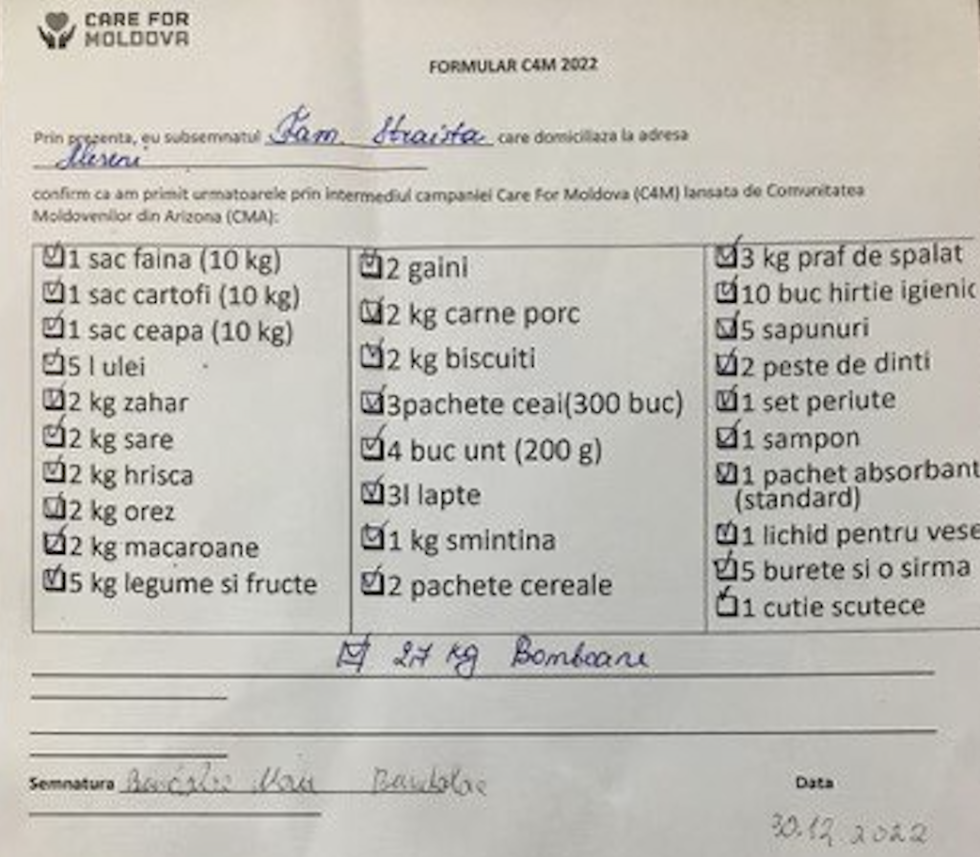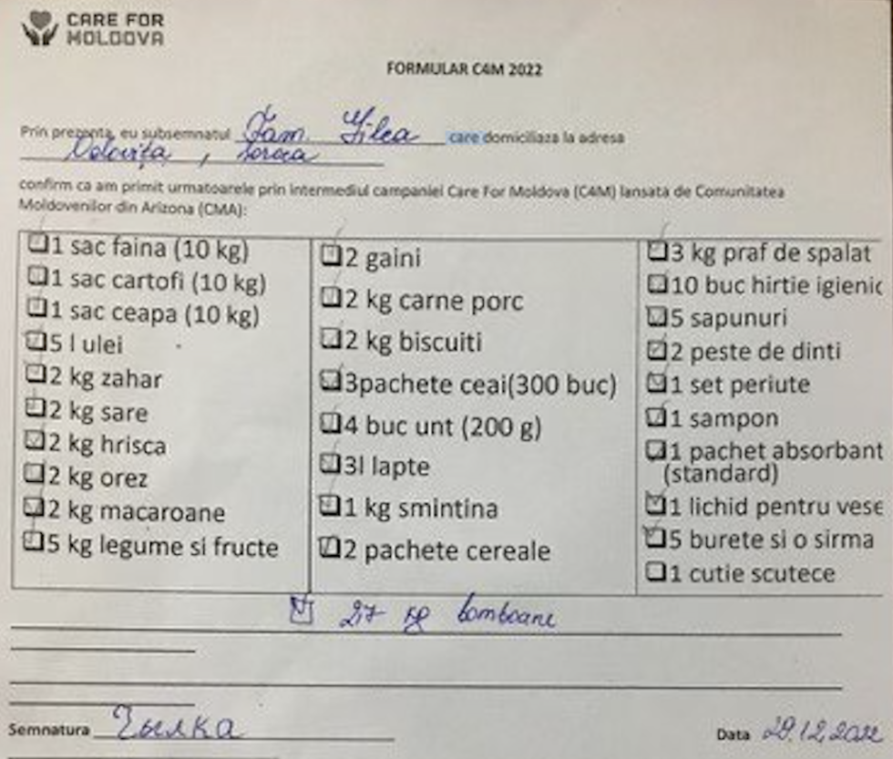 Every beneficiary of the Care Package C4M will sign a C4M Formulary that will confirm that the produce (food and hygene) had reached the destination.